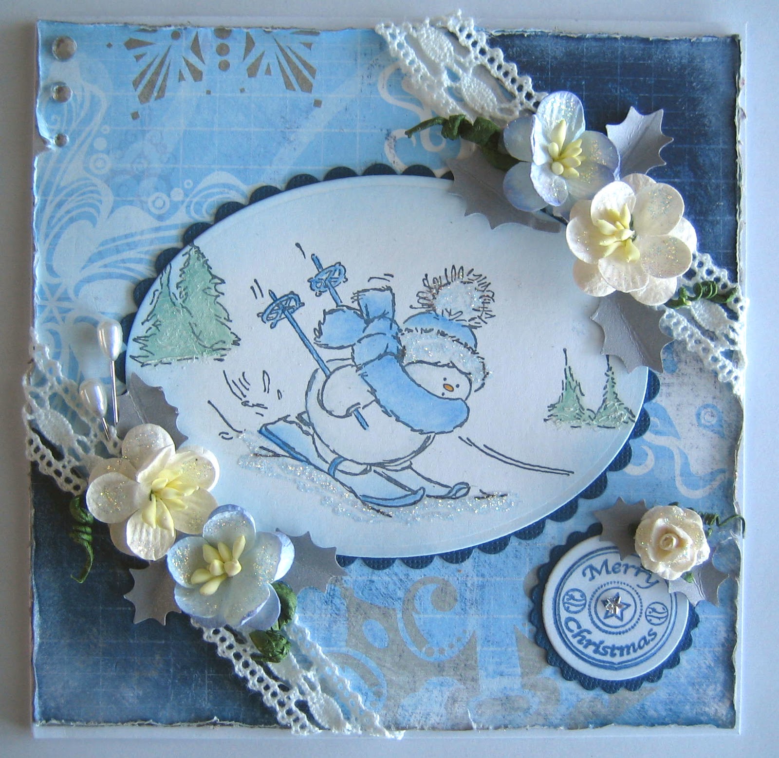 Vandaag heb ik al twee weken een blog en wil ik voor het eerst met een challenge meedoen. Aangezien ik stempel afdrukken inkleur met derwent potloden stuur ik deze kaart naar de allesmetenoverkleurenmetderwent challenge, de  eisen zijn : een kaart met sneeuwpop in blauw/grijs en ik zag dat er ook een challenge is bij simon says stamp met de kleuren blauw, wit  en zilver, (liefst met penny black afbeelding)  aangezien deze kaart aan allebei de eisen voldoet stuur het daar ook naar toe.